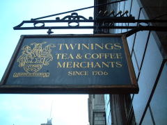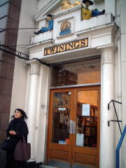 ストランド通りにあるトワイニングの本店です。この両隣の建物は非常に大きく、このお店はビルの谷間にあるっていう感じです。金色のライオンと二人の中国人が座っていますね。